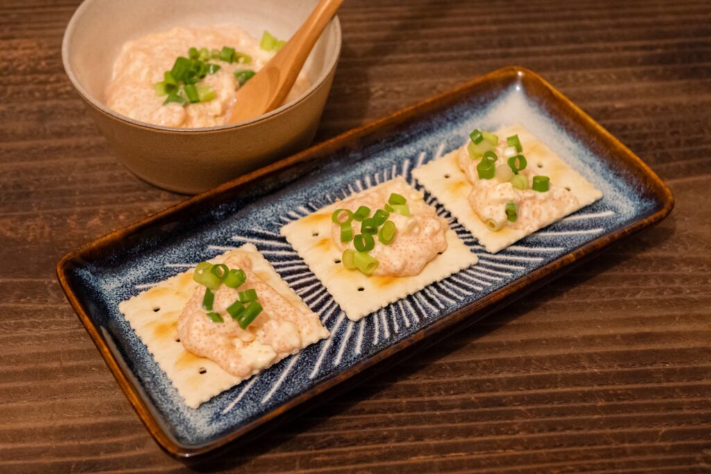 最初に紹介するのは、クリーミーでまろやかな「明太子クリームチーズディップ」です。濃厚なクリームチーズとピリ辛の明太子が絶妙にマッチして、お酒のお供にぴったりです。クラッカーやバゲット、野菜スティックにつけて楽しんでください。