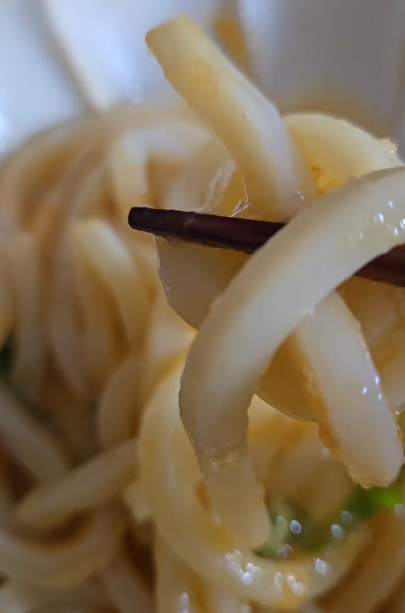 明太子のほどよい塩気と卵黄のまろやかさがうどん全体にやさしく絡み、白だしを少し加えることで、だしの香りがふわっと広がりながら味がすっとまとまります。